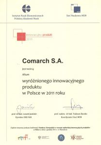 ![]() | Instytut Nauk Ekonomicznych Polskiej Akademii Nauk oraz Sieć Naukowa MSN wyróżniły firmę Comarch jako twórcę inteligentnej platformy klasy ERP – Comarch ALTUM, która przez te instytucje została uznana innowacyjnym produktem w Polsce w 2011 roku. Comarch ALTUM znalazł się wśród 19 najbardziej innowacyjnych produktów, o czym zdecydowały dane z kwestionariuszy, jakie zostały przesłane do Instytutu Nauk Ekonomicznych PAN przez przedsiębiorstwa, instytuty badawcze i ośrodki akademickie. – Wyróżnienie PAN dla innowacyjności systemu Comarch ALTUM jest dla nas bardzo cenne, przede wszystkim dlatego, że zostało przyznane przez uznaną polską organizację naukową. Do tej pory byliśmy nagradzani głównie za granicą, jednak system Comarch ALTUM dedykowany jest zarówno na rynki zagraniczne, jak i na rynek Polski. Klienci zauważają i doceniają innowacyjność platformy Comarch ALTUM. Już 70 firm w Polsce, Austrii, Francji i Niemczech wdrożyło system Comarch ALTUM. Cieszy nas fakt, że innowacyjny wizerunek systemu umacnia się także w środowisku naukowym – mówi Edyta Kozek, Business Development Manager ERP w Comarch.